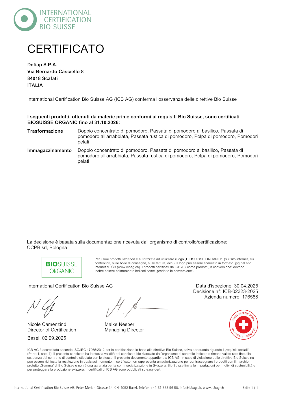 Regolamento bio e UE 2018/848 con integrazioni e modifiche, relativamente alla produzione biologica e all’etichettatura dei prodotti biologici, la Defiap ha deciso di aderire a una serie di prescrizioni e per questo ha sottoposto tutte le fasi del proprio processo produttivo al controllo di un organismo di controllo e certificazione autorizzato dalle autorità pubbliche competenti in applicazione della normativa cogente, (CCPB).